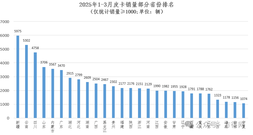 从省份销量排名来看,新疆反超云南拿下省份上牌数冠军。一季度,新疆累计销量5975辆,云南累销5302辆,四川紧随其后销量为4758辆。山东、内蒙古、广东销量在3000辆以上。共有16个省级行政区销量大于2000辆。
